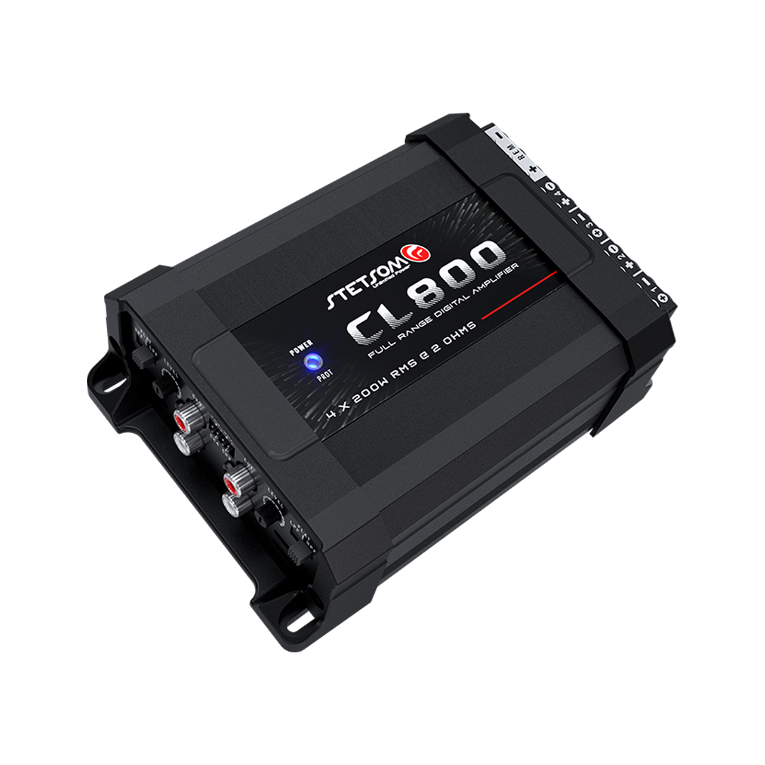 Potência RMS em 2 Ohm 14,4V 4 x 200W