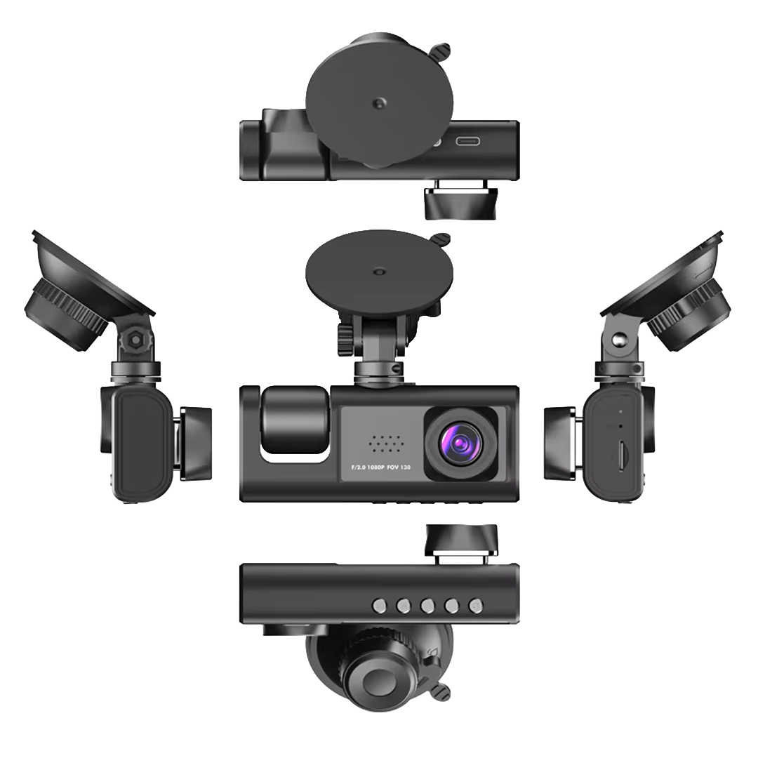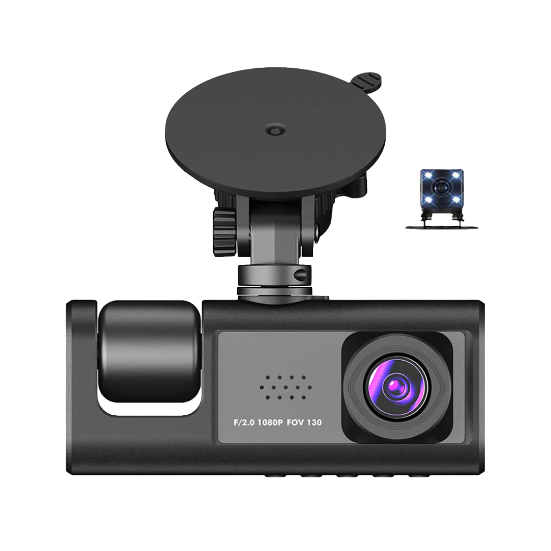 Grabadora con 3 cámaras (delantera, interior y trasera) soporta imagen FHD/HD y audio.