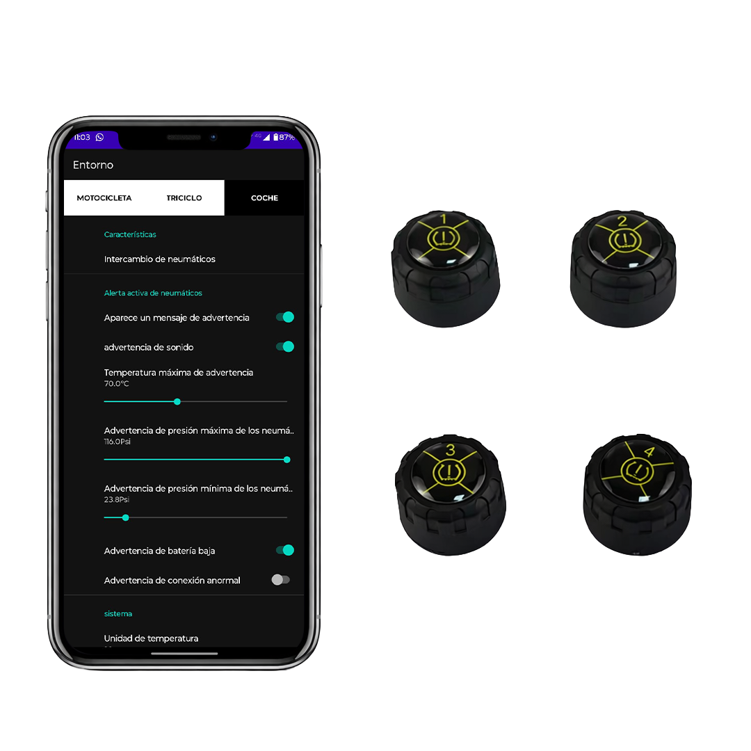App que permite visualizar en tiempo real presión y temperatura de cada neumático y tensión de la batería del sensor.