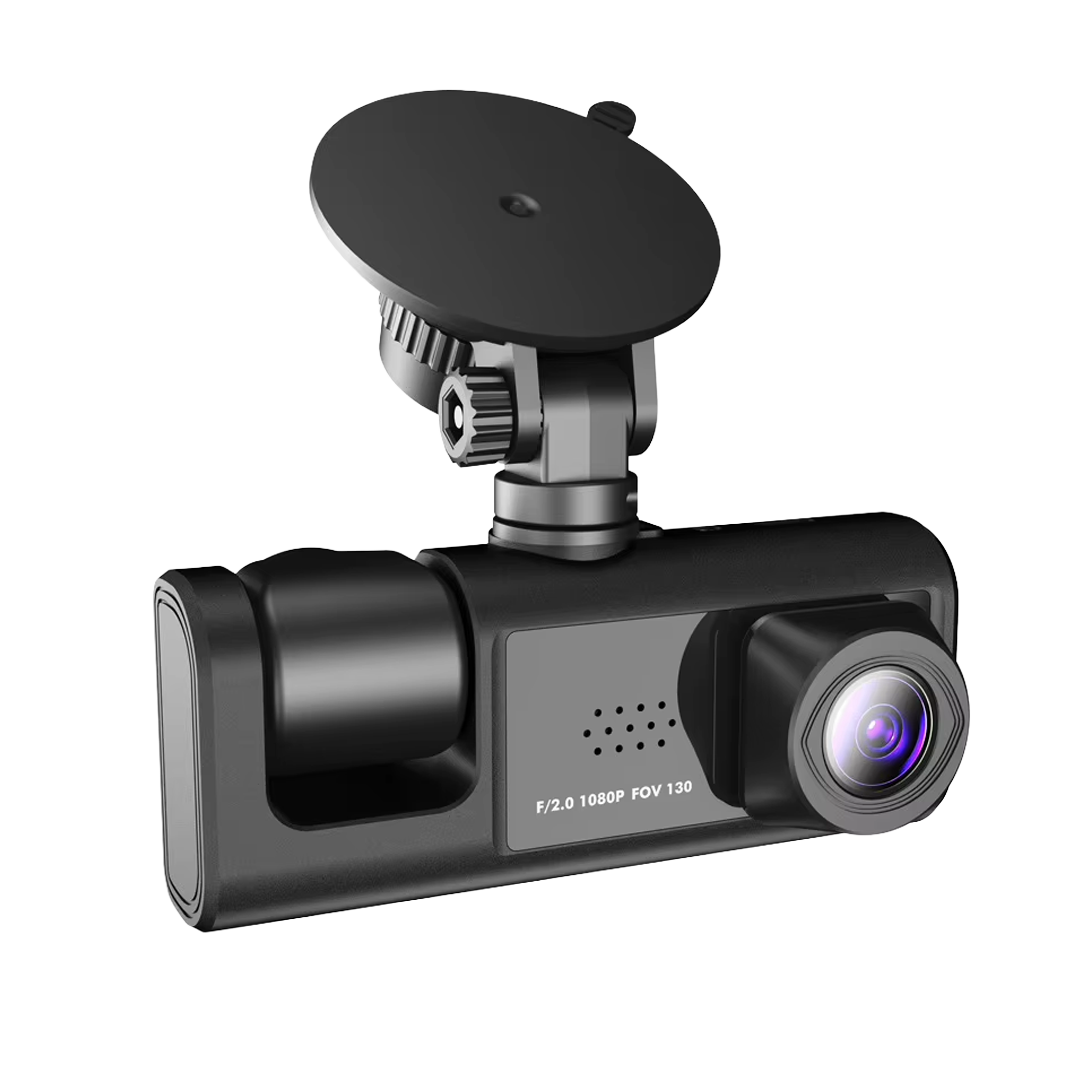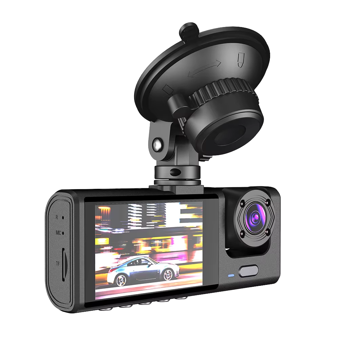Grabadora con 3 cámaras (delantera, interior y trasera) soporta imagen FHD/HD y audio.